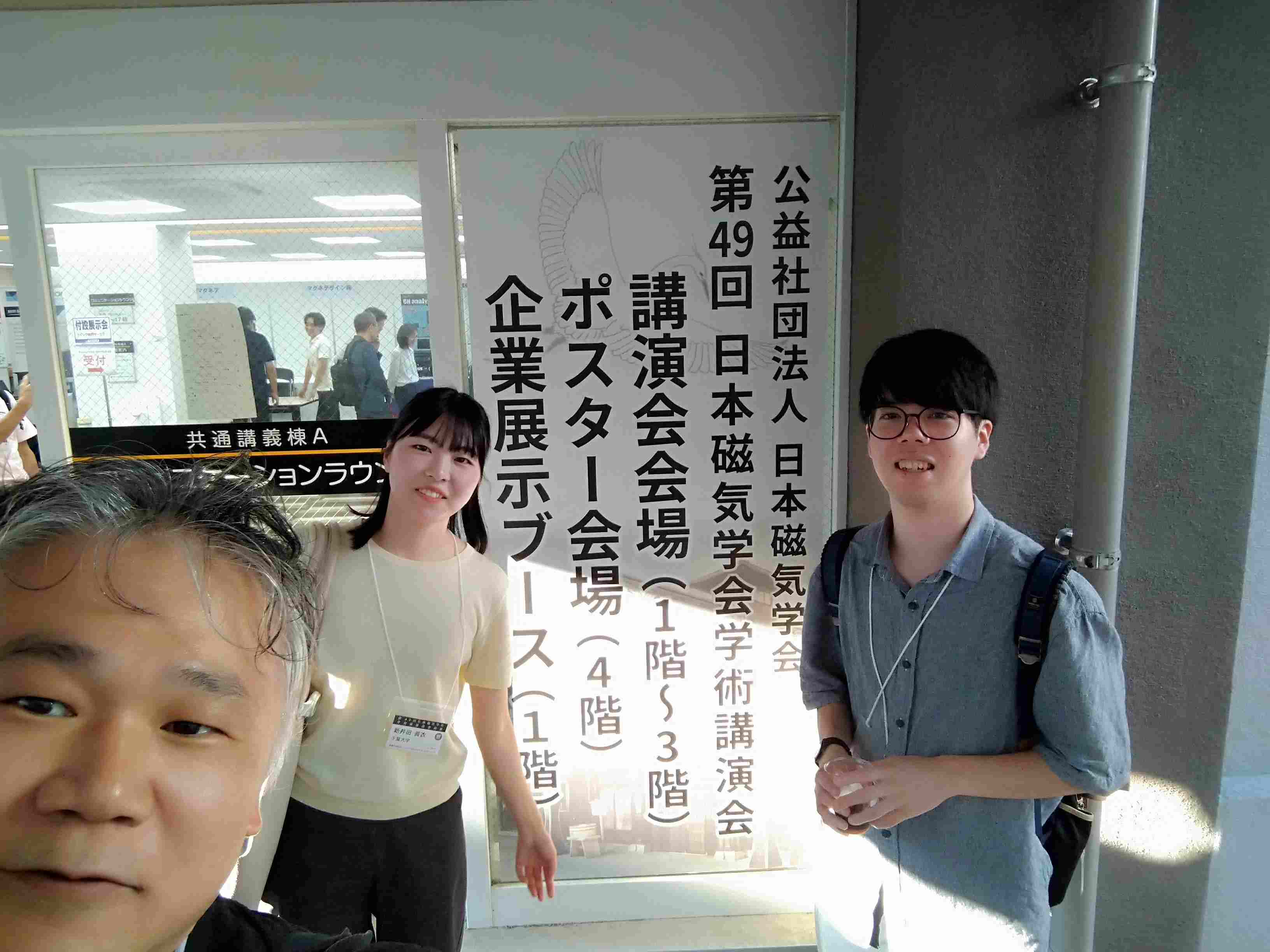 本永君、新井田さん、橋本君、日本磁気学会主催、初等磁気工学講座およびサマースクールに参加し、情報収集、交流を行いました。