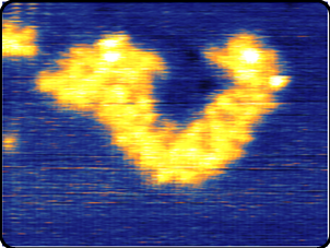 STM探針を使用すると、原子だけでなく「分子」も動かす事ができます。molecule manipualtion と呼びます。右図で、黒く見えている点が、1個のCO分子 (carbon monoxide)です。Cu(111)基板に対しCO分子は炭素C原子がCu原子と結合し、酸素O原子が上向きに直立しています。STM探針からみると、酸素O原子がしか見えません。CO分子位置でのトンネル伝導値は、金属Cu(111)基板より低いため、”見せかけ上”CO分子の高さは低く暗く見えています。STM金属タングステン探針を接近させると、タングステン原子と酸素O原子との間に引力が働きます。タングステン原子に引っ張られるようにして酸素O原子が引っ張られ、CO分子が探針を追うようにして動きます。右図はCO分子10個をつかって”ニコニコ”マークを描いた様子です。
